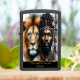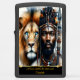 A fierce African warrior stands tall alongside a majestic lion, embodying the spirit of courage and unity. Adorned with traditional beads and tribal attire, the warrior's gaze is intense and focused. The lion, with its striking blue eyes and powerful presence, symbolizes bravery and loyalty.