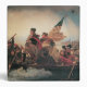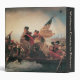 Vintage illustration travel and transportation design featuring a fine art Victorian Era painting titled Washington Crossing the Delaware, 1851. By artist Emanuel Leutze. It commemorates General George Washington's crossing of the icy Delaware River during the American Revolutionary War with military soldiers carrying the American Flag on the night of December 25th, 1776. That historical action was the first move in a surprise attack against the Hessian forces at Trenton, New Jersey in the Battle of Trenton. The flag of the United States of America at this time was not the current stars and stripes that is pictured, the historically accurate flag would have been the Grand Union Flag, officially hoisted by Washington himself on January 2, 1776.