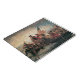 Vintage illustration travel and transportation design featuring a fine art Victorian Era painting titled Washington Crossing the Delaware, 1851. By artist Emanuel Leutze. It commemorates General George Washington's crossing of the icy Delaware River during the American Revolutionary War with military soldiers carrying the American Flag on the night of December 25th, 1776. That historical action was the first move in a surprise attack against the Hessian forces at Trenton, New Jersey in the Battle of Trenton. The flag of the United States of America at this time was not the current stars and stripes that is pictured, the historically accurate flag would have been the Grand Union Flag, officially hoisted by Washington himself on January 2, 1776.