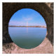 Original photograph taken during the Cherry Blossom Festival 2022. Beautiful spring blue skies, and a stone circle frame the Washington Monument and tidal basin.
