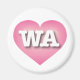 This magnet features a cool pink heart with a white-washed center containing the bold, white, upper case letters WA, the official abbreviation for Washington, the evergreen state.