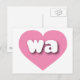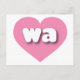 This postcard features a pink heart containing the bold, white, rounded, lower case letters wa, a playful abbreviation for Washington, the evergreen state. The reverse side of the postcard is blank, awaiting your customized text or handwritten sentiments.