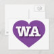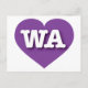This postcard features a vibrant purple heart containing the bold, white, upper case letters WA, the official abbreviation for Washington, the evergreen state. The reverse side of the postcard is blank, awaiting your handwritten sentiments or customized text. Choose font style, size, and color.