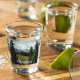 Shot glass that features a scenic photo image of snow capped Mount Rainier and scenic surrounding landscape in the Cascade Mountains of the Pacific Northwest state of Washington. A great barware and travel souvenir gift idea!