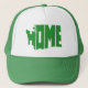 The silhouette map shape of the state of Washington filled in green with green bold capital letters that spell the word home make this trucker hat is perfect for someone from the evergreen state that likes to keep the sun out of their eyes and hair out of the rain.