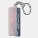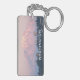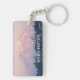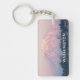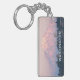 Rectangular, acrylic, double-sided key chain that features a scenic landscape photo image of a pink alpenglow on Mount Rainier and a Puget Sound city, located in the Pacific Northwest state of Washington. Makes a great travel souvenir!