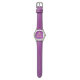 Rainbow colored numbers with minute hashes at outside. Central design is three triangles in orange, pink and yellow. All on a purple background.