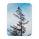 A photograph of an American Bald Eagle perched atop a tall Pine Tree. A blue sky with misty clouds are in the background. Traces of sunlight and snow can be found on the tree and it's branches.