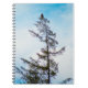 A photograph of an American Bald Eagle perched atop a tall Pine Tree. A blue sky with misty clouds are in the background. Traces of sunlight and snow can be found on the tree and it's branches.