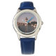 This blue-banded watch is designed with my photo of the famous red-and-white lighthouse in Hilton Head, SC.