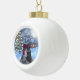This ceramic Christmas ornament features an original digital artwork by Jayne Wilson, depicting a young girl and her dog, eagerly watching the skies for a sight of Santa's sleigh.