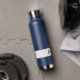 This insulated water bottle is shown in navy blue with a custom sample name.