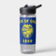 Crafted with attention to detail, this water bottle celebrates Oregon's natural beauty and heritage. The flag design proudly showcases a field of navy blue with a gold shield depicting a setting sun, mountains, forests, and a blue river with a beaver, symbolizing the state's diverse landscapes and historical significance.