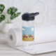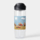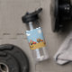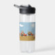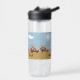 Water Bottle with a design of trucks and flowers on a bee design sky in blue with a bright sun and clouds/ The bottom is tan. The name on the bottle can be changed. Thanks to Creative Fabrica for some of the elements in the design.