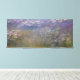 Water Lilies by Claude Monet, oil on canvas 1915-1926, is a large, panoramic landscape painting of a pool of water lily pads floating upon a pool of calm water in a flower garden pond, the forms of the plants on and under the water dissolving into the atmosphere and reflections of the surrounding garden plants. Painting from the elaborate flower garden at his home in Giverny, Monet fills the entire picture plane with a nearly abstract composition, as his Water Lilies series heralded much of the abstract painting of the 20th century.