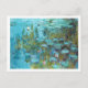 A fine art postcard featuring the painting by Claude Monet (1840-1926), Water Lilies 1914. Depicted is a tranquil pond landscape with green lily pads and pink flowers on striking blue water.