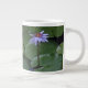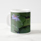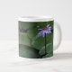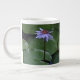 The artwork on this Giant Mug is an original photograph by MaeFlowers of a water lily, a flower blooming amid the lily pads floating on the water. The flower is a lovely lavender blue color, standing out from the dark green, round lilypads.