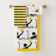 Water polo player black silhouette, monogram and stripes bathroom towel set design. It showcases a minimalist pictogram icon of a black silhouette of a water ball player holding his ball in front of the goal. The hand towel includes a striped pattern in yellow, black and white and the washcloth is of white color with your monogram and the same icon.