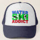 A hat for the water ski addict. It features black silhouettes of slalom, trick, and jump water skiers and includes the text "WATER SKI ADDICT" in blue, green and red letters.