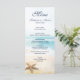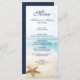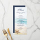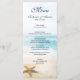 Coastal theme wedding menu features a watercolor abstract beach with tropical turquoise ocean waves, gold sand and starfish seashell. The classic style script font is in nautical navy blue to coordinate with the reverse side. Personalize with your names, wedding date and menu options.