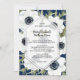 Elegant black and white anemone flowers and leaves watercolor on a navy blue background and your wedding ceremony details in chic lettering on a transparent white diamond overlay. MATCHING items in our store.
