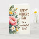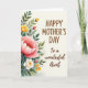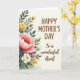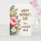 Designed with a soft watercolor floral border, this card places a lush arrangement along the left side and gently around the top and bottom edges. A large coral-pink flower takes center stage, its many petals opening toward the viewer with a sunny yellow stamen that draws the eye like a warm hug ❤️. Around it, smaller yellow blossoms, tiny white flowers with golden centers, and a few red-and-yellow buds nestle into flowing green leaves, creating the feeling of closeness you’d see in a caring family moment. The background is a creamy off-white that fades into a light teal wash, giving the scene calm depth and a breezy, springtime feel 🌼. The message sits on the open right side of the layout, leaving plenty of breathing room beside the florals. The text reads “Happy Mother’s Day To a wonderful Aunt” in earthy brown lettering, stacked neatly so it feels balanced against the bouquet. Fine details show tight buds near the lower edge and fully open blooms reaching upward on the left.