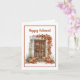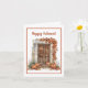 This greeting card features a watercolor image of a cozy door surrounded by autumn leaves and pumpkins, with the words Happy Autumn centered above. The greeting inside reads: Wishing you a magical autumn filled with warmth and joy! May the vibrant colors of nature surround you and bring happiness to your heart and home. All text may be personalized to your wishes.
