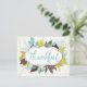 Watercolor leaves in olive green, browns, teal, and light aqua, with a wood - look background in white. Reads "Thankful" in a modern, stylish font over a bracket frame. Perfect for the thanksgiving holiday season or even for wedding thank yous!