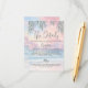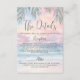A soft pastel sunset watercolor background blends pinks, oranges, and purples over the ocean, with gentle waves meeting the shore. Delicate palm leaves frame the top, adding a tropical, airy touch. The design appears on both sides, with space for accommodations, reception location, dress code, transportation, wedding website, and more. A refined mix of elegant script and classic serif fonts gives a stylish yet relaxed look. Text is in dark gray by default, but all fonts, wording, and colors can be customized to suit your celebration perfectly.