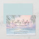 A pastel sunset watercolor background blends soft pinks, oranges, and purples over the ocean, with gentle waves lapping the shore. Palm tree-inspired fonts appear at the top, setting a relaxed tropical tone. The text uses a graceful mix of flowing script and classic serif fonts for elegance and readability. Guests can fill in names, attendance, dietary preferences, or song requests. All wording, fonts, and colors are fully customizable to match your wedding style.