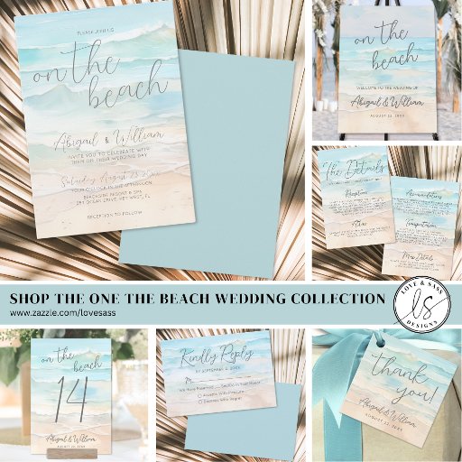 A calming blue and tan beach watercolor background sets the tone for your elegant seaside wedding. The soft, slightly abstract coastal scene shows where the ocean waves meet the shore—creating a peaceful and stylish backdrop for your reply card.