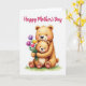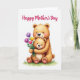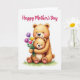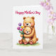 This card shows a soft watercolor-style scene of two cuddly bear-like animals, a larger adult hugging a smaller one close with a tender, protective lean. Their fur is painted in warm earthy browns with gentle shading and visible brush textures, and both faces have rosy cheeks and easy smiles that feel affectionate ❤️. The smaller figure holds up a bouquet as if offering it with shy pride, adding a sweet, friendly-romantic touch to the moment. The flowers include tulip-like blooms in purple, yellow, and pink, gathered tightly in its paws as the bigger figure’s arm wraps around from the side. A short message sits above the characters, centered near the top in a soft, medium-tone color that stands out calmly against the white space. Below them, a small patch of fresh green grass grounds the pair without adding extra background clutter 🌼. The white background keeps attention on their gentle expressions and the close embrace. The bouquet shows three main tulip-like blooms—one purple, one yellow, and one pink—clustered together above the green grass.