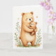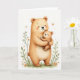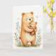 This card shows a larger brown bear cuddling a smaller bear close, their rounded shapes and gentle poses creating a cozy, affectionate scene ❤️. The adult bear’s eyes are softly closed with a calm smile, while the little one rests against them with a trusting, outward gaze that feels like a quiet “I’m safe with you.” Warm caramel and creamy honey tones shade their fur, with faint texture marks and rosy cheek circles adding softness. The background stays bright white, making the embrace stand out like a tender moment caught in still air. A short Mother’s Day message sits near the top in a soft, darker tone, centered above the bears so it reads first without crowding the art. The overall look resembles light watercolor washes, with edges that fade gently and keep the mood calm and caring 🌼. Along the bottom edge, a few green sprigs, tiny orange star-shaped flowers, and scattered dots form a simple border beneath their feet.