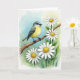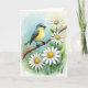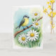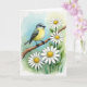 This card features a watercolor-style scene centered on a small bird perched on a rough, diagonal branch, its soft gray head and bright yellow chest leaning slightly as if listening to someone nearby. Dark gray wings fold neatly along its sides, and a glossy dark eye looks to the right with a gentle, attentive focus that feels like quiet companionship ❤️. The background fades from light sky blue in the upper left into fresh green across the lower and right areas, suggesting a sunlit garden clearing. Around the branch, several daisy-like flowers bloom with white petals and warm yellow centers, spaced like friendly faces gathered close. Fine linework sharpens the feather edges and bark texture while the surrounding washes stay soft, letting the bird and blossoms stand out without looking harsh. Any greeting text sits up near the top against the blue area in a medium gray tone, with a smaller line placed near the bottom right over the green for balance 🌼. The flowers cluster most densely near the lower right, with a few petals overlapping the branch as it angles upward.