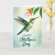 This card features a watercolor-style bird caught mid-flight, its shimmering green feathers set off by an orange-red throat and a bright white belly, as it tilts toward a bell-shaped flower like a gentle greeting ❤️. The slender dark beak points toward the bloom, suggesting a soft, affectionate moment in a garden scene. The flower glows in red-orange tones with visible stamens, framed by leafy greens that curl around it like a protective embrace. Behind them, the background fades from pale yellow into muted sage green, giving the look of warm sunlight filtering through leaves 🌼. Near the upper portion, the words “HAPPY Mother’s Day” appear in deep teal, with “HAPPY” in neat capital letters and “Mother’s Day” in flowing lettering beneath it. The text sits comfortably above the bird and flower, leaving plenty of open space so the illustration feels airy and calm. Subtle paint washes and soft edges around the wings and petals add a tender, romantic softness to the scene. A gentle gradient glow lingers behind the bird’s outstretched wings, while the red-orange petals stand out against the green leaves.