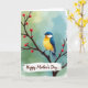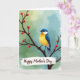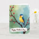 This greeting card features a small bird perched on a dark, slender branch, its blue head and wings contrasting with a sunny yellow chest and a crisp white patch on its face. The bird’s dark eye looks gently to the left, as if sharing a quiet, affectionate moment with someone just out of view ❤️. Along the branch, clusters of glossy red berries add little sparks of color, like tiny gifts tucked into the scene. Behind everything, a soft watercolor background shifts from leafy green on the left to calm sky blue on the right, giving the setting a relaxed, caring feel. Near the bottom, a wide white brushstroke runs horizontally and holds the message “Happy Mother’s Day..” in dark, flowing cursive lettering 🌼. The textures are easy to notice, from the bird’s feathery edges to the smooth shine on the berries and the airy wash behind them. The white text band sits at the base of the image, stretching across the width beneath the branch and berries.