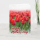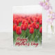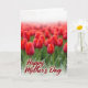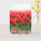 Designed with a sweeping field of red blossoms, the scene stretches wide like a soft sea of petals, with a few sharply focused flower buds up front showing delicate red petals and fresh green stems. The foreground blooms lean toward one another as if sharing a quiet moment, adding a gentle note of closeness ❤️. Farther back, the flowers melt into a smooth red haze that fades into a bright white horizon, giving the setting an airy, open feel. Warm, diffused light settles over the field, creating small highlights on the petals and soft shadows around the stems without harsh contrast. Centered over the flowers is the text “Happy Mother’s Day,” placed across the middle area in deep burgundy lettering with a faint glow so it stands out against the reds. The message sits lightly on the image rather than covering it, letting the blossoms remain the main focus 🌼. In the distance, the red tones gradually thin into a pale, high-key band of white at the top edge of the design.