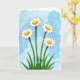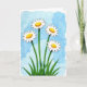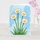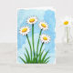 Designed with a watercolor look, the front shows four meadow flowers clustered close together, as if leaning in like friends sharing a quiet moment ❤️. Slender green stems rise from a thick patch of grass, guiding your eye up to wide white petals edged with a thin dark line. Each bloom has a round golden-yellow center with tiny speckled details and a soft highlight that makes it feel gently sunlit. The background fades into layered sky blues with softly blurred cloud shapes, giving the scene an airy, open setting. Near the top, a short Mother’s Day message sits in a simple dark font, spaced neatly so it doesn’t crowd the flowers 🌼. The overall layout feels balanced, with the blooms reaching upward and leaving comfortable breathing room around the lettering. Subtle paper texture shows through the paint, and the blue wash shifts from deeper tones at the edges to lighter tones behind the petals.