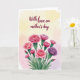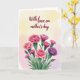 On the front of the card a lush bouquet of full, ruffled blossoms fills the lower half of a tall layout, with petals shaded from fuchsia and soft pink into deeper purple. Slender green stems and small leaves weave upward, as if the flowers are leaning in close like friends sharing a quiet moment ❤️. Behind them, a watery background fades from warm, sunlit yellow near the top into a gentle blush pink toward the bottom, giving the scene a soft, airy glow. A short Mother’s Day message sits in the upper middle area, written in a deep burgundy tone that stands out against the light wash. The lettering appears smooth and flowing, spaced with plenty of room so the flowers feel like they’re offering the words rather than competing with them. The overall color mix feels tender and calm, like a bouquet set out for someone special at breakfast 🌼. The lower edge is packed with layered petals, while the top remains open and bright with the burgundy text centered above the blooms.