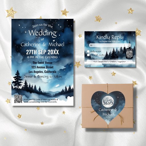 To ensure a seamless experience for your guests, our design includes a customizable QR code, making it easy for them to access all the important details of your astronomy-inspired wedding. Whether it's for RSVPs, directions, or a digital guestbook, the QR code adds a modern touch to this classic, starry theme. Celebrate your love story that is truly written in the stars with our Watercolor Blue Starry Night Sky Celestial Wedding design, and create a night that you and your guests will remember forever.