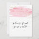 This watercolor blush and gold please find your table sign is perfect for a simple wedding. The luxurious feminine design features a light pink watercolor texture with a splash of faux gold glitter dust and an elegant calligraphy script font. The card prints on the front and back (double-sided).