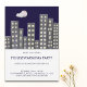 Watercolor housewarming party invitation with an illustration a night sky apartment buildings city. Personalize the text with your own. Illustrated and designed by Patricia Alvarez.