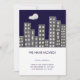 Watercolor moving announcement with an illustration a night sky apartment buildings city. Personalize the text with your own. Illustrated and designed by Patricia Alvarez.