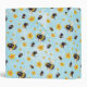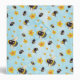 A pretty watercolor design featuring bumblebees and flowers over a blue background.