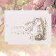 Easter greeting card featuring a watercolor illustration of a bunny guarding a nest of colorful pastel Easter eggs below a flowering magnolia tree blooming in pink and white watercolor flowers all set on a soft pink background. Bold script Happy Easter to the left of illustration in a green font to match. A smaller version of the illustration is repeated on the bottom right on the back of card with room for a personal handwritten note. Additional sizes available.