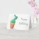 A cute birthday card with a script font in green and a potted cactus plant painted in watercolor.