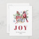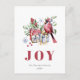 This cozy holiday postcard features a watercolor illustration of a red cardinal perched atop a collection of gift-wrapped Christmas presents and surrounded by holly and mistletoe greenery and stylized blue snowflakes. The word "JOY" appears in large, muted red serif letters that coordinate with the art. Add your family's name and the year in charcoal gray italics, and your return address on the back.