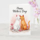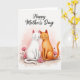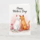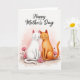 This card features two stylized cats cuddled close, with a white cat resting its cheek against an apricot-colored cat in a quiet, affectionate nuzzle ❤️. The white cat’s eyes are closed as if savoring the closeness, while the apricot cat wears a small, content smile that suggests easy companionship. Behind them, a soft blush-pink wash fills the background and fades gently toward a lightly textured ground beneath their paws. Bright pink roses and a few buds frame the pair around the sides, adding a romantic garden feel without overwhelming the scene 🌼. The message “Happy Mother’s Day” sits near the top in flowing pink lettering that stands out against the pale background. Fine details like slender whiskers and softly shaded fur keep the cats looking tender and calm. The roses show layered petals in deep pink tones, with green hints at the stems and leaves.