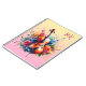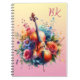 Watercolor ai art depicting a cello surrounded by pretty red, blue and orange flowers and foliage botanical art. Personalized notebook.