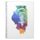 This design features a map of the US State of Illinois featuring the city of Chicago with a multicoloured hand painted watercolor texture. "Chicago" stylized text is added overtop with a star to indicate the location of the city.